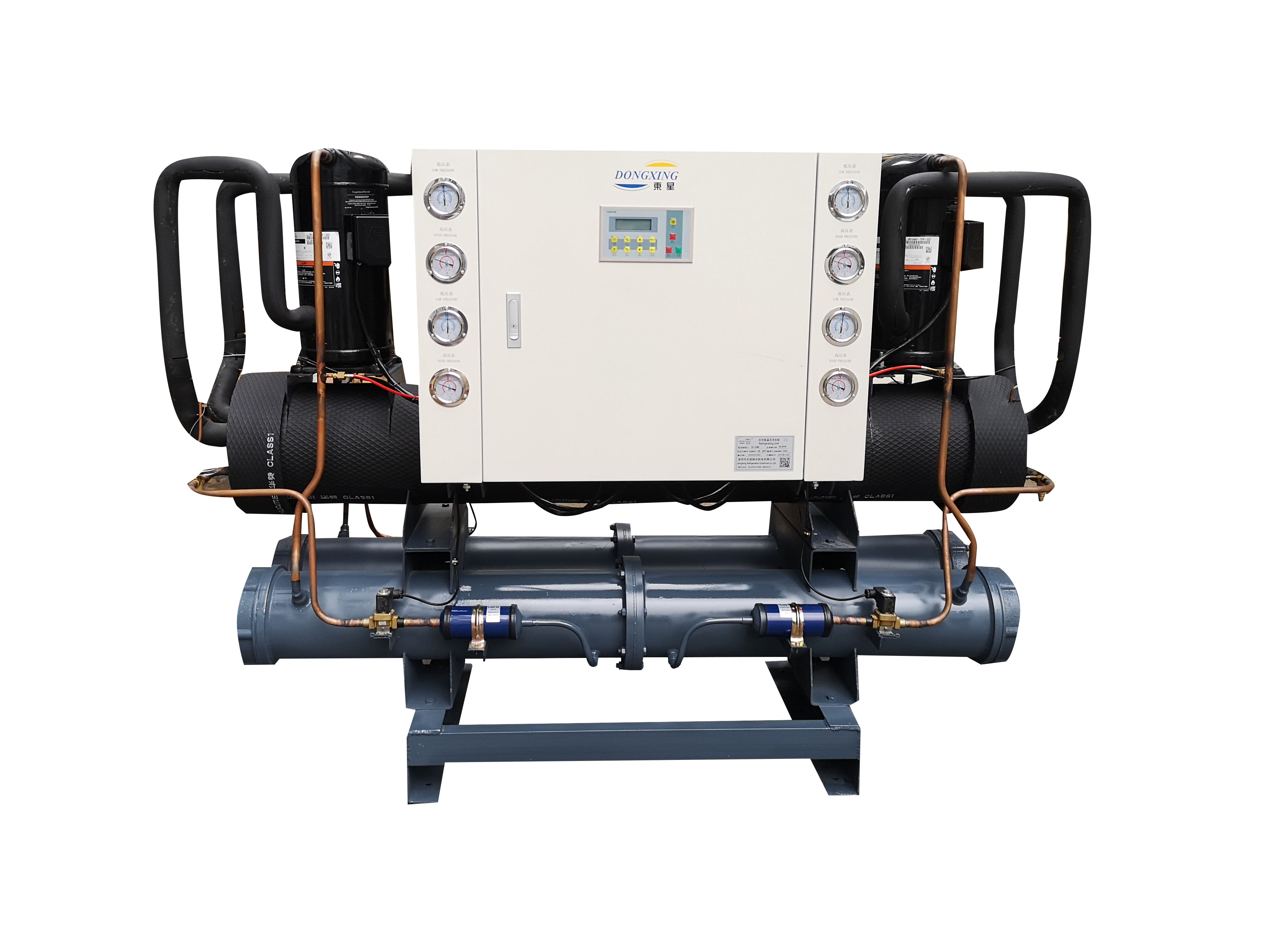 經久耐用:制冷心臟采用全密封低噪音,振動小,高效能省電進口壓縮機,電器控制全部采用進口原件,熱交換器采用殼管冷凝器,換熱效能高,便于清洗保養。