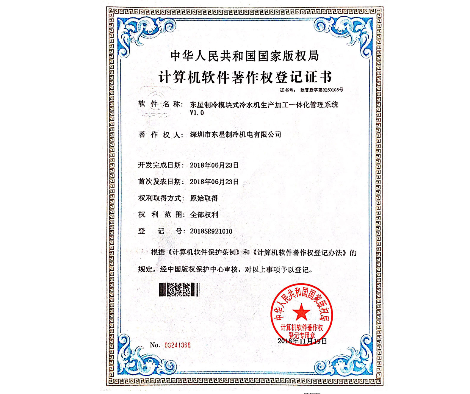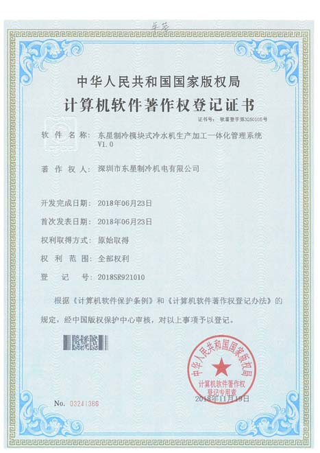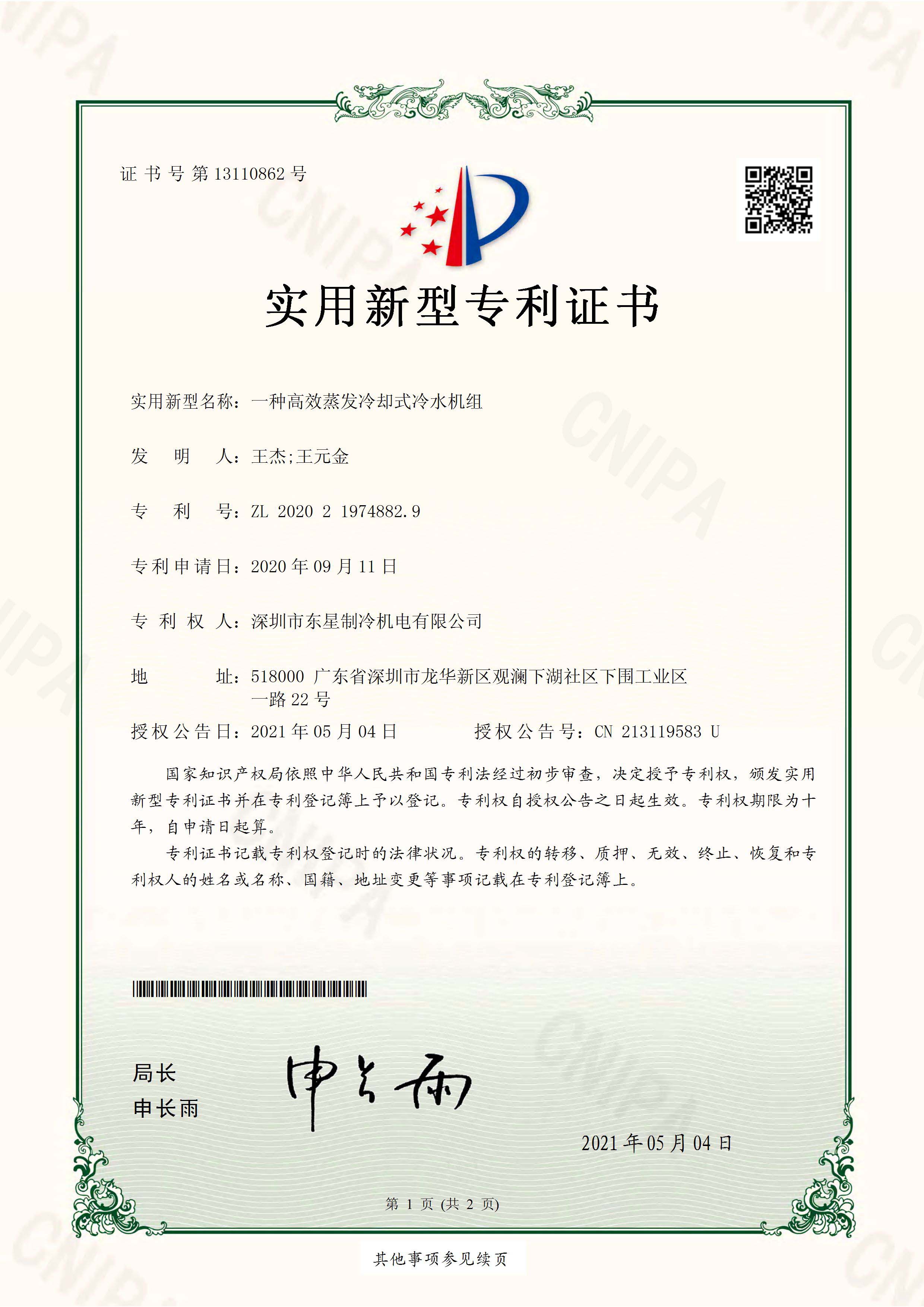 實(shí)用新型專(zhuān)利證書(shū)高效蒸發(fā)冷卻式冷水機(jī)